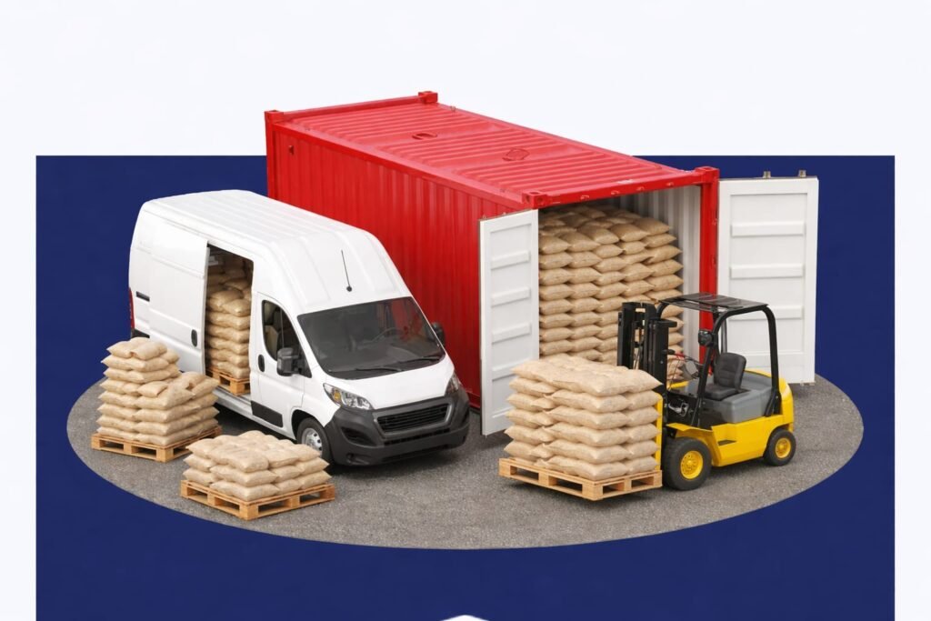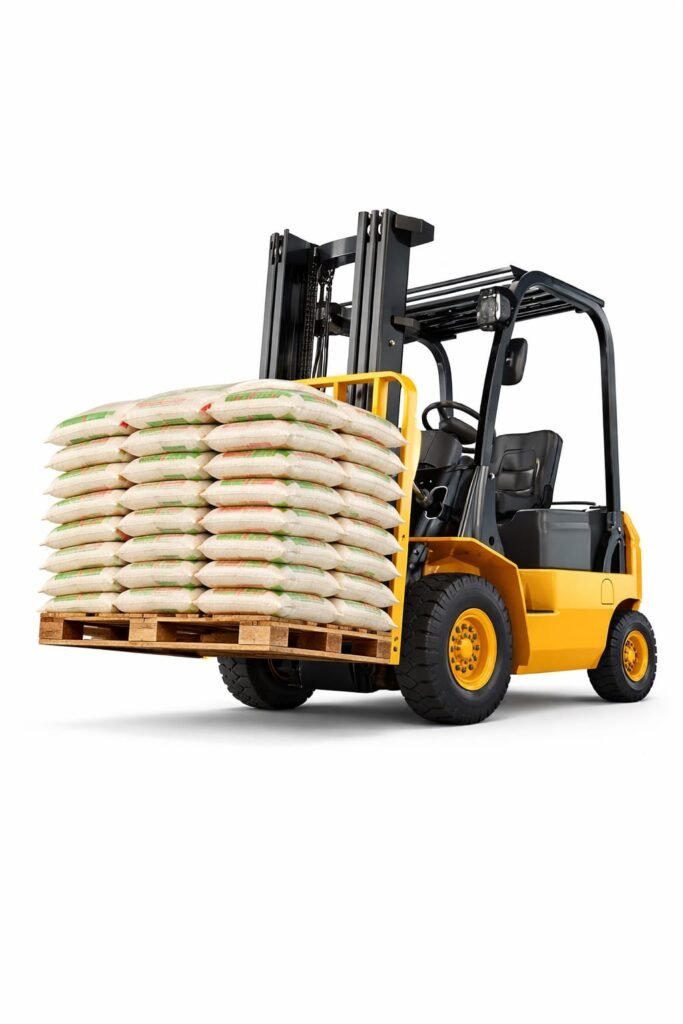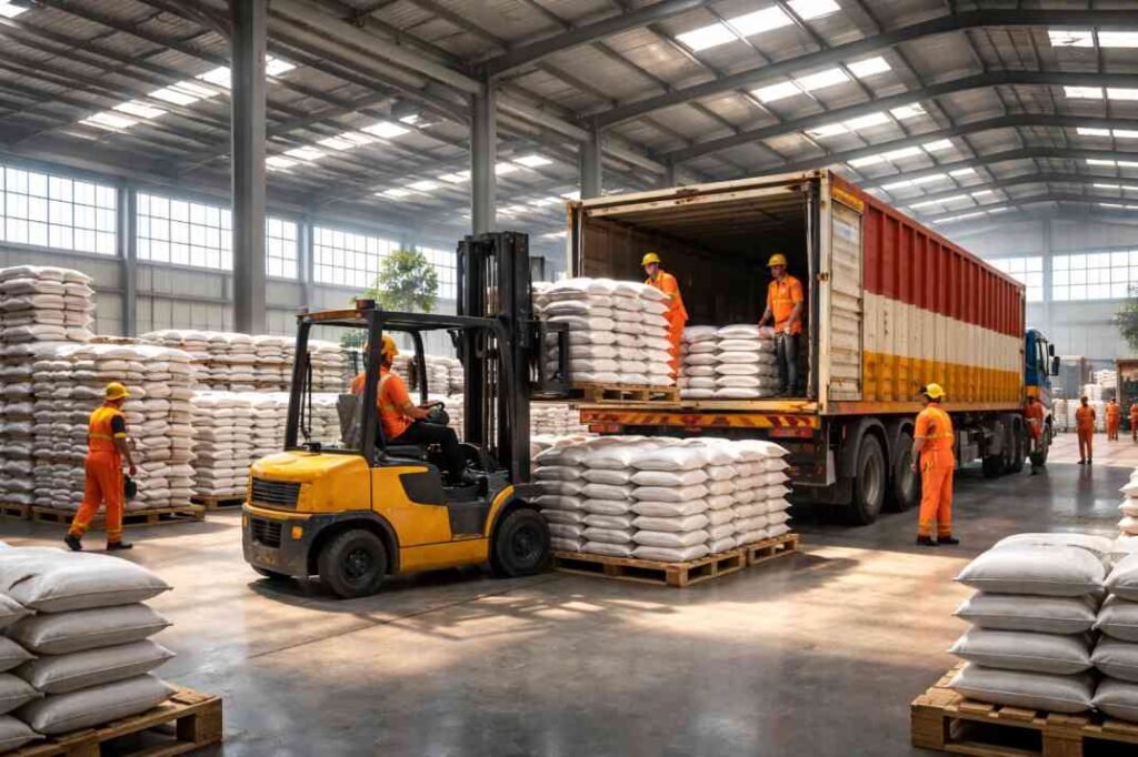 Rice bags are carefully loaded and stacked using modern equipment to ensure safe handling and smooth transportation.